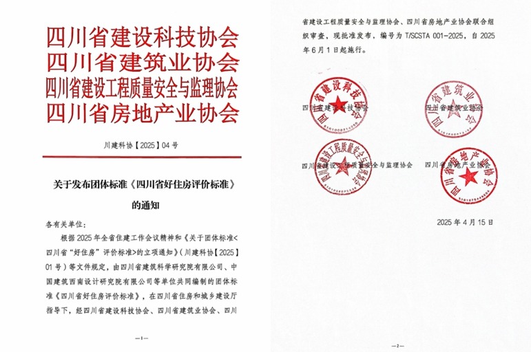 4月15日,《四川省好住房评价标准(T/SCSTA 001-2025)(以下简称《标准》)正式发布,将于2025年6月1日起实施。 这是国家标准《住宅项目规范》(GB 55038-2025)发布后,全国首个落地的地方性“好房子”评价标准。 四川建科院,凭借雄厚的科研技术实力和全产业链技术服务优势,成为《标准》的主编单位,本着以建筑科技赋能人民群众美好生活,引领建筑产业高质量发展的使命担当,从调研、起草到意见征集、修订成稿,全过程、全身心推动《标准》标准编制落地。